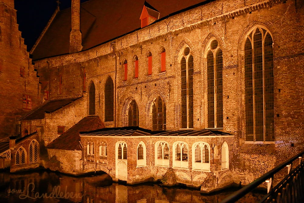 Auf keinen Fall wollten wir uns Brügge bei Nacht entgehen lassen. Die vielen angestrahlten Gebäude und noch dazu die spiegelnden Wasseroberflächen…!