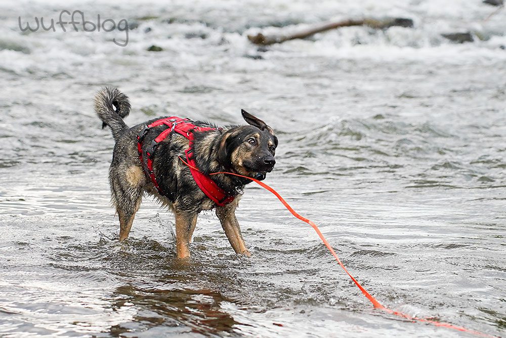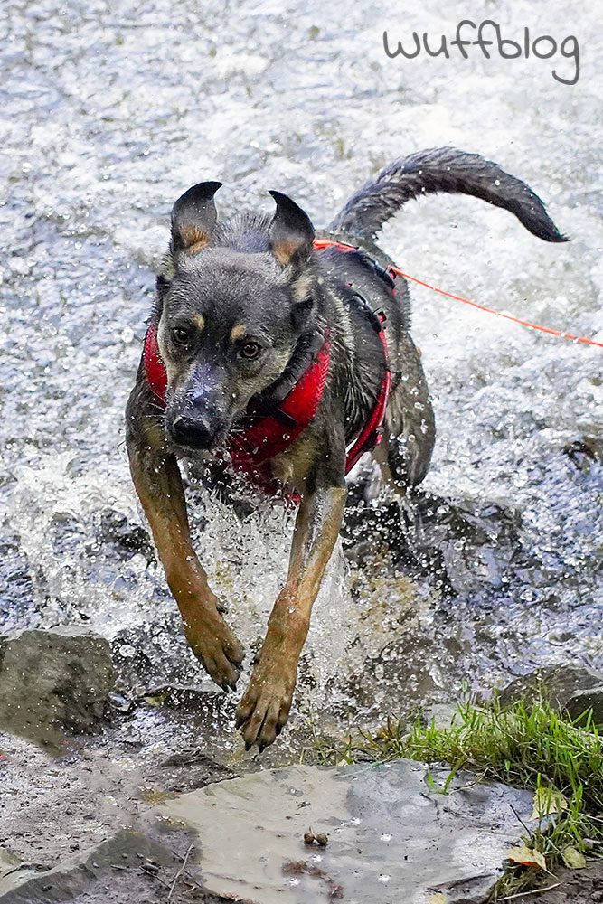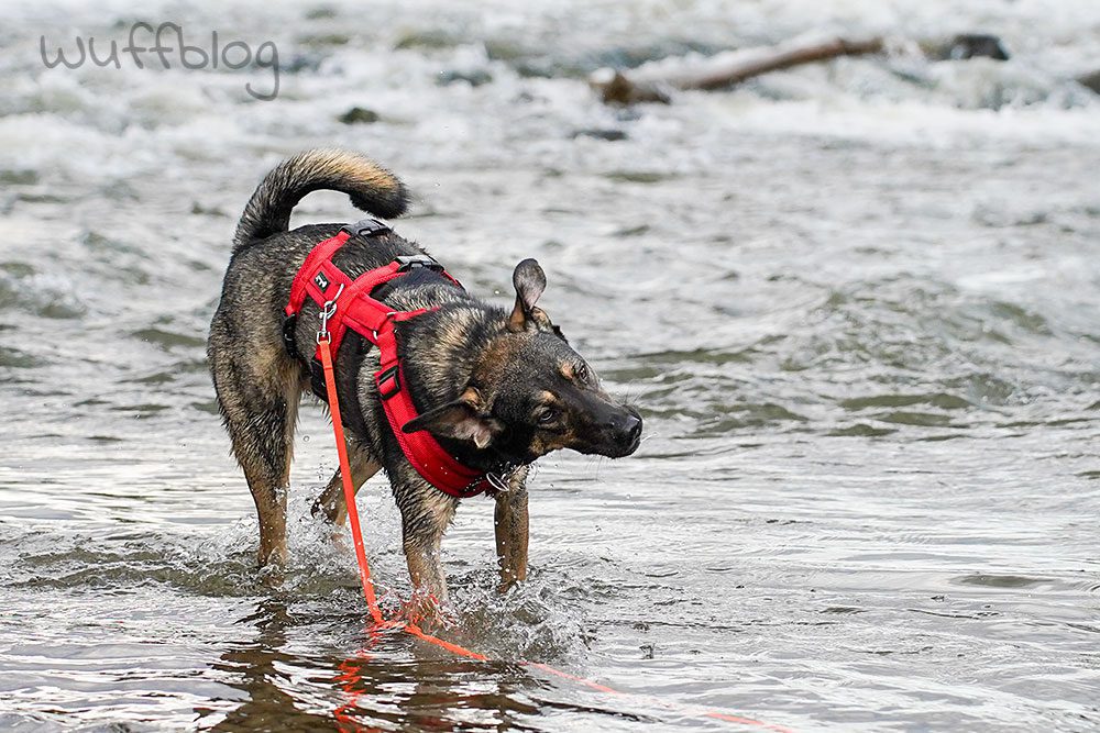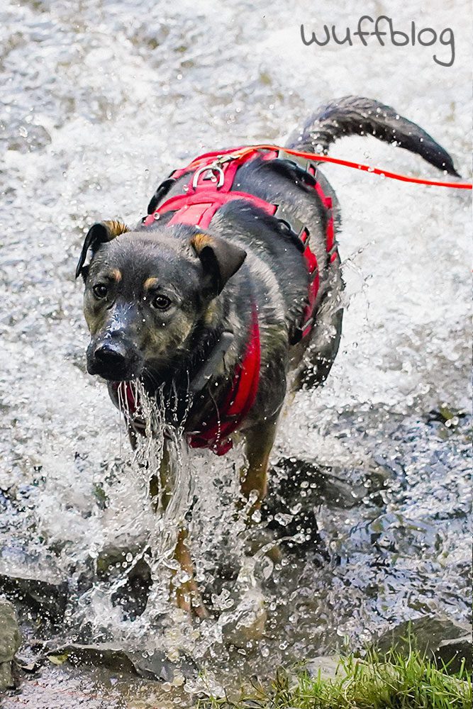 Nach einem ersten vorsichtigen Schnuppern war superschnell klar: unser Hundemädchen liebt Wasser! Als hätte sie nie etwas anderes gemacht, marschierte Bonnie in den Fluss und planschte begeistert drauflos.
