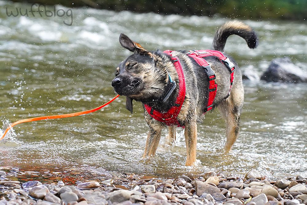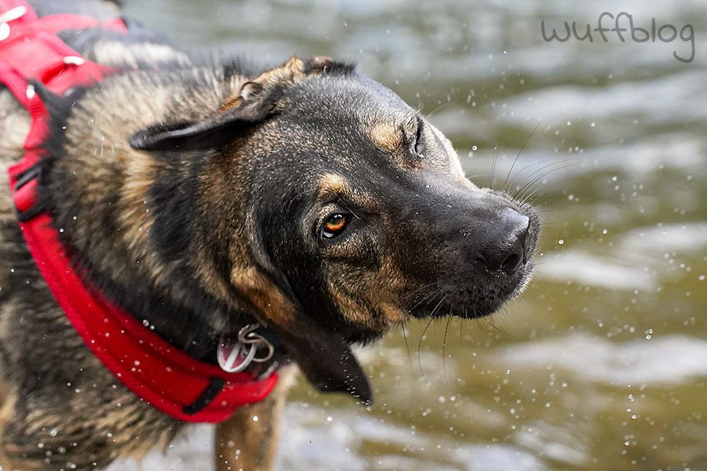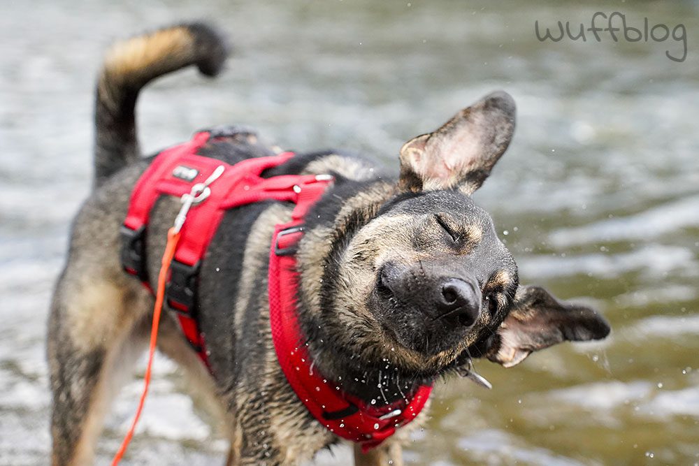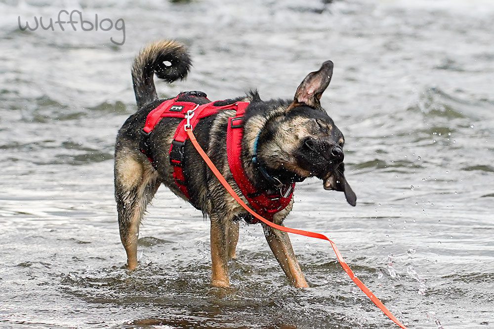 Und was macht ein nasser Hund?! – Klaro, er schüttelt sich, dass die Wassertropfen nur so durch die Luft fliegen! Da kam ich in Sachen Hundefotografie voll auf meine Kosten. 😀