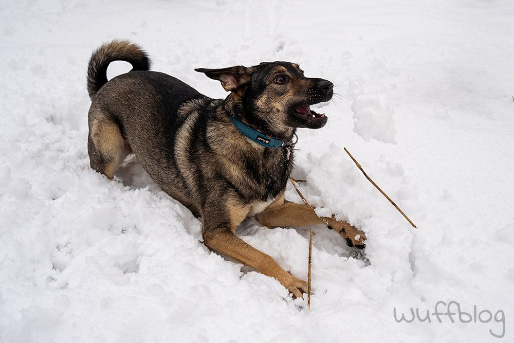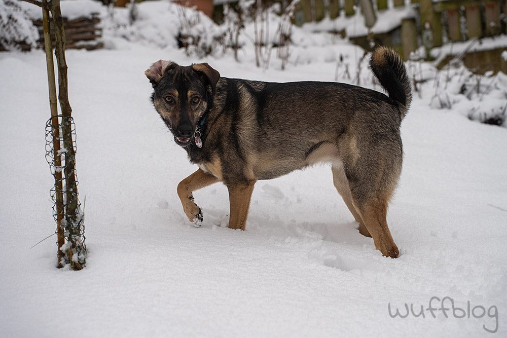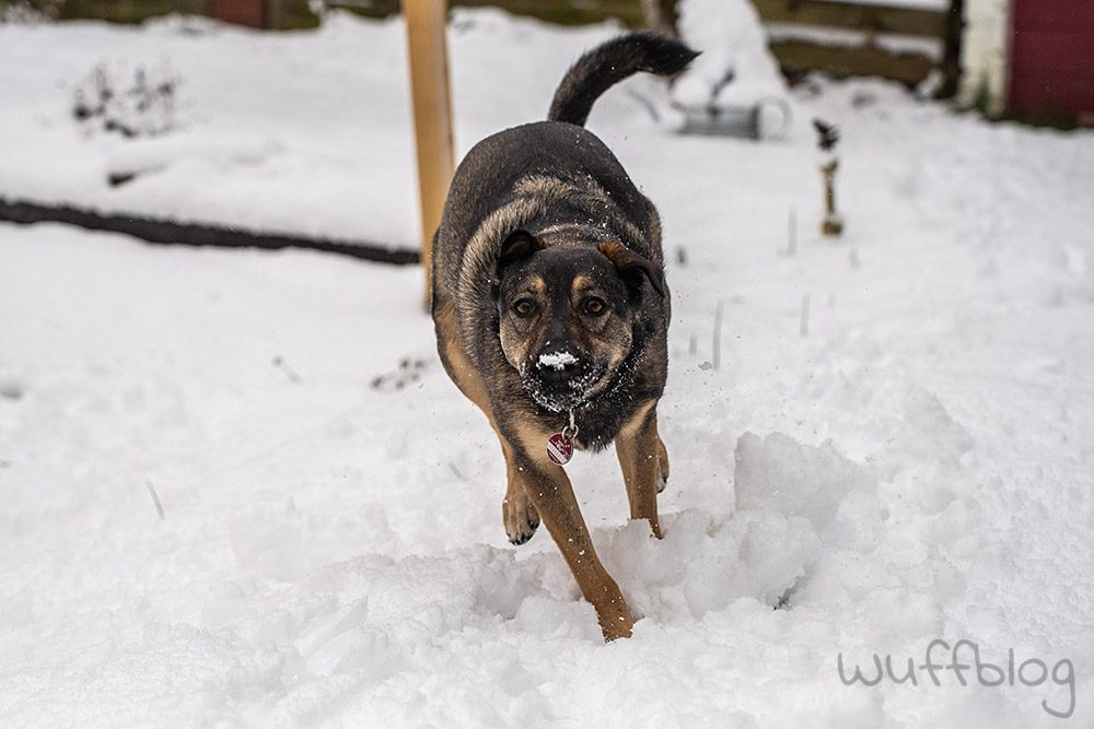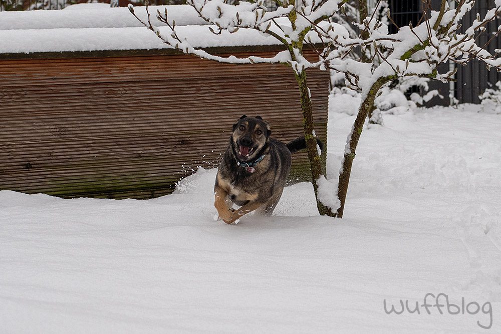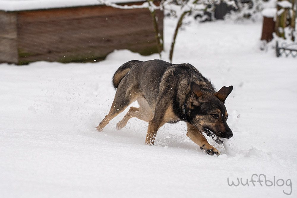 Vorhin habe ich daher denn gleich mal die Kamera mit in den Garten genommen und unser nicht mehr ganz so kleines Hundekind beim Toben im Schnee abgelichtet.