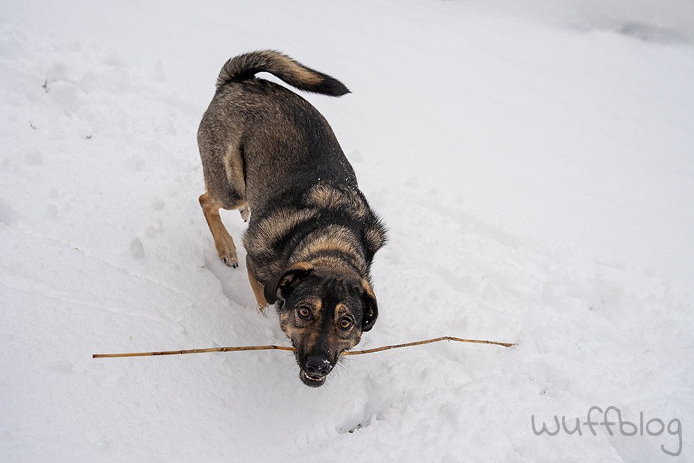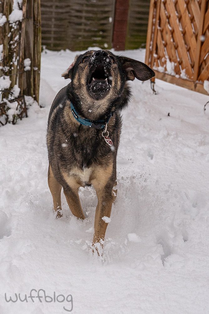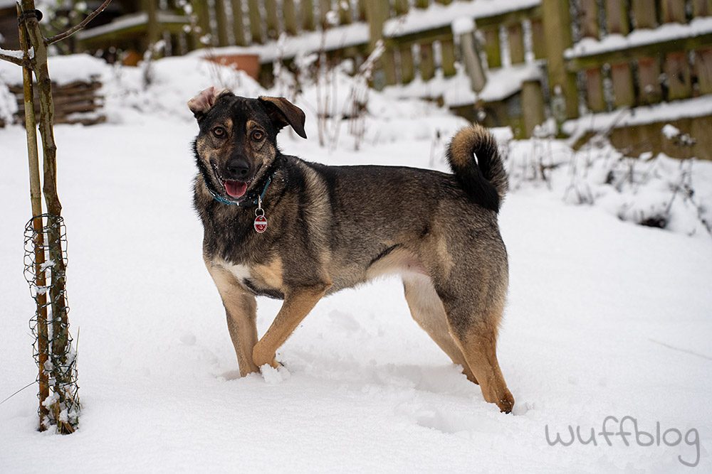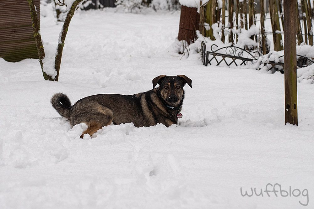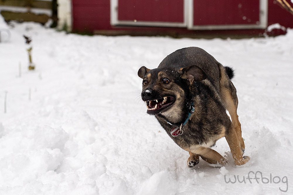 Vorhin habe ich daher denn gleich mal die Kamera mit in den Garten genommen und unser nicht mehr ganz so kleines Hundekind beim Toben im Schnee abgelichtet.