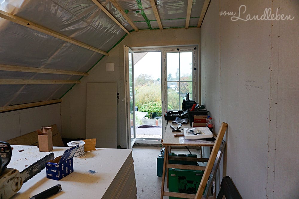 Das Dachgeschoss wurde ja erst verhältnismäßig spät ausgebaut. Obwohl unser Richttermin bereits am 23. August war, kamen die Wände hier erst rund zwei Monate später, Ende Oktober.
