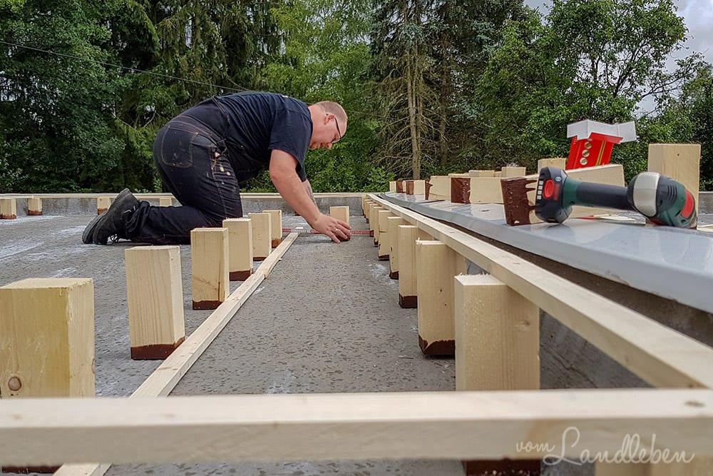 Für Dach No. 2 und 3 markierten wir daher direkt auf dem Dach die Abstände für die Pfosten, markierten die Verbindungen mit einer Schlagschnur und richteten die Pöller entsprechend aus.