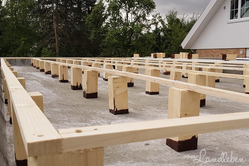 Die Herausforderung hierbei: das Garagendach weist nach hinten hin ein Gefälle auf, damit das Wasser gut in Richtung der Regenrohre abfließt – die Pfosten wurden also alle unterschiedlich lang. Um sie später richtig aufzubauen, haben wir sie von 1 bis 12 durchnummeriert.