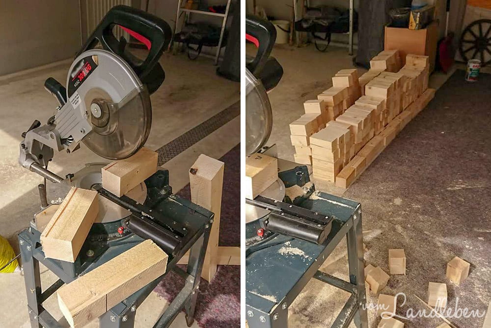 72 Pfosten je Dach ergibt 216 Pöller, das Abmessen und Sägen hat eine Weile gedauert. 😀