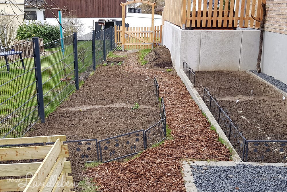 Die Nachbarn lösten zwei Hochbeete auf und fragten, ob ich die Erde gebrauchen könne. Na klar! Ich schippte sie durch unser Durchwurfsieb und erhielt so nicht nur um die 20 Schubkarren voll Erde, sondern auch noch Rindenmulch. Mit dem mulche ich ja eh gerne unter Sträuchern, auf den Baumscheiben und so weiter.