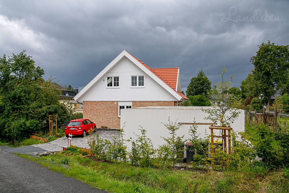 Wir haben noch ein Stück gepflastert: ursprünglich lag zwischen unserer Grundstücksgrenze und der Straße ja ein Schotterstreifen. Falls die Gemeinde irgendwann mal einen Regenwasserkanal bauen würde, könnten wir den ganz einfach zurückbauen. Wie sich jedoch herausstellte, grub sich das Motorrad beim Drüberfahren dermaßen tief in den Schotter, dass es saugefährlich war. Daher haben wir dieses Stück jetzt doch noch gepflastert (die Genehmigung dafür hatten wir eh schon).