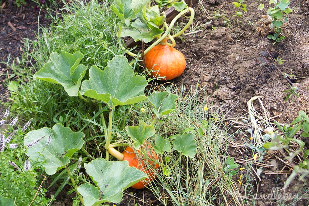 Die Hokkaido-Kürbisse tragen Früchte, die mittlerweile ein sattes Orangerot erreicht haben. Bis zur Ernte dauert es also nicht mehr lange.