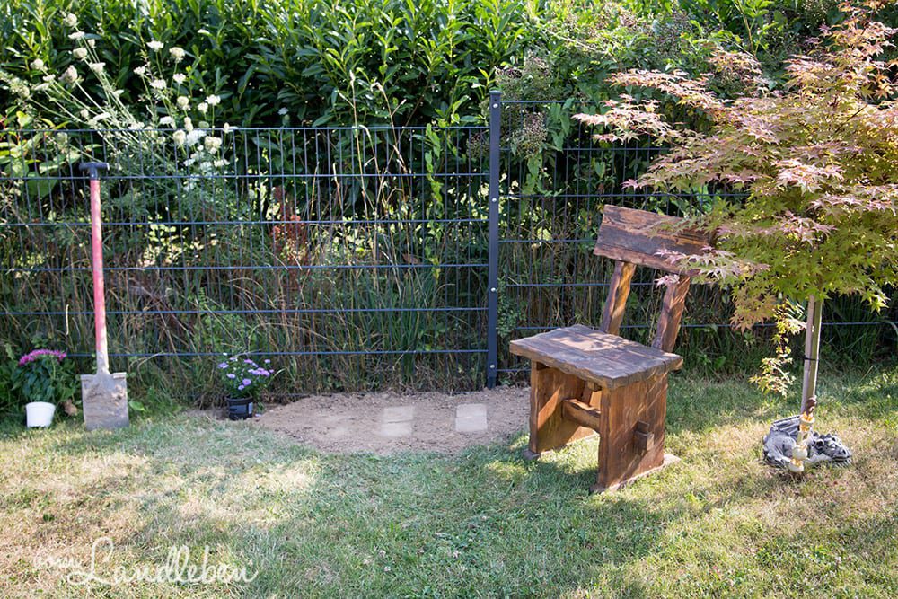 Neben der Terrasse hat einer der beiden „neuen alten“ Holzstühle sein Zuhause gefunden. Damit das Holz nicht fault, steht er nicht direkt auf der Erde. Stattdessen habe ich den Rasen entfernt, vier Ziegelsteine als Standfläche eingegraben und ringsum ein Beet angelegt. Bei knochentrockenem Lehmboden ist sowas übrigens ein Klacks… nicht. 😀 Anschließend habe ich Indianernesseln und Astern gepflanzt und das Beet gemulcht.