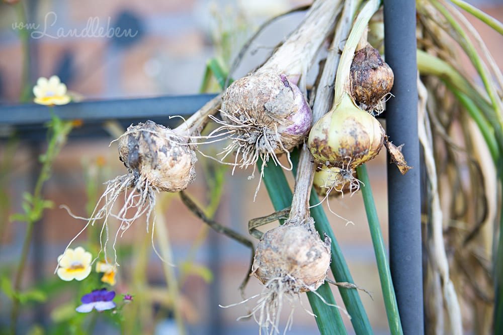Den Knoblauch und die Zwiebeln habe ich ausgegraben und zum Trocknen auf der Terrasse aufgehängt.