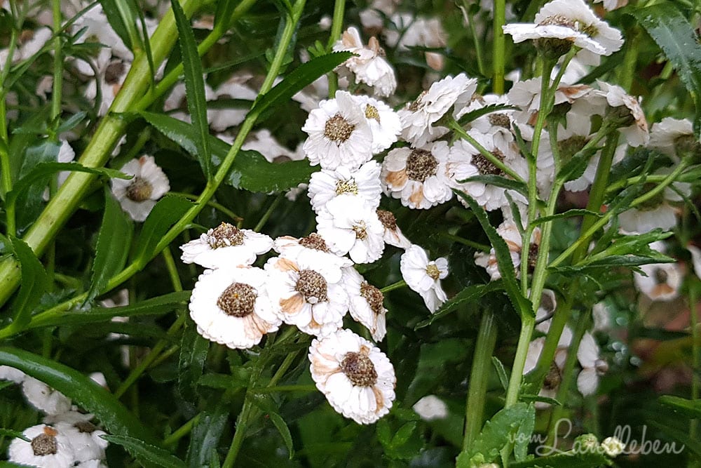 Doch, das ist tatsächlich Schafgarbe: Achillea Ptarmica „The Pearl“, also Sumpf-Schafgarbe. Bei der sehen die Blüten anders aus als bei der Gemeinen Schafgarbe (Achillea Millefolium), die sich sonst meistens in den Gärten findet. Ich hab mal gerade eine Nahaufnahme für dich gemacht: https://lieblingsalltag.de/wp-content/uploads/2019/08/sumpf-schafgarbe-vom-landleben.jpg
