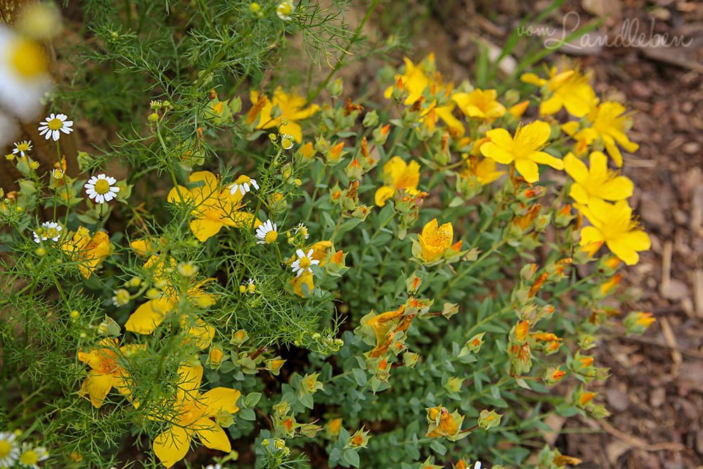 Zugegebenermaßen wachsen hier derzeit mehr Blumen und (Wild-)Kräuter als Gemüse. 😀 Teilweise hat das damit zu tun, dass ich im Frühjahr einfach nicht auf allen Flächen mit der Aussaat hinterhergekommen bin, teilweise aber auch mit großen Plänen, die wir für diesen Bereich haben. Aber dazu demnächst mehr. 🙂