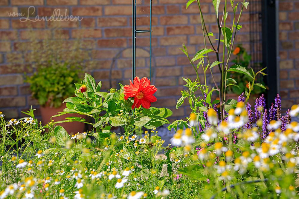 Auf der anderen Seite, an den Mülltonnen, leuchtet die orangerot blühende Kapuzinerkresse. Die ersten Ringelblumenblüten haben sich bereits dazugesellt, demnächst dürfte auch der Phlox loslegen. In der Hecke wächst eine wilde Rose, die gerade wunderschön blüht.