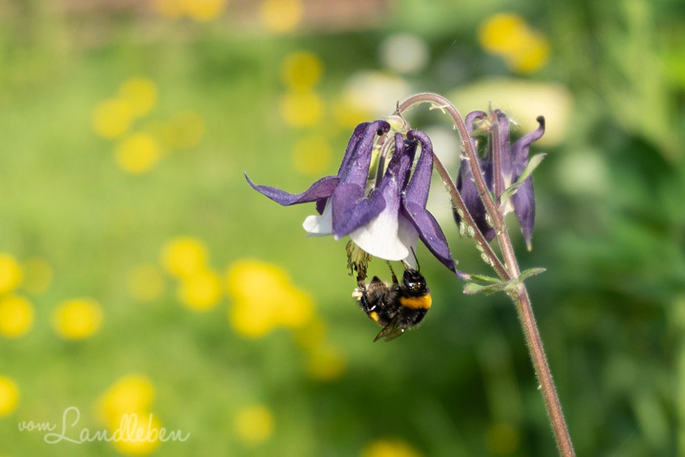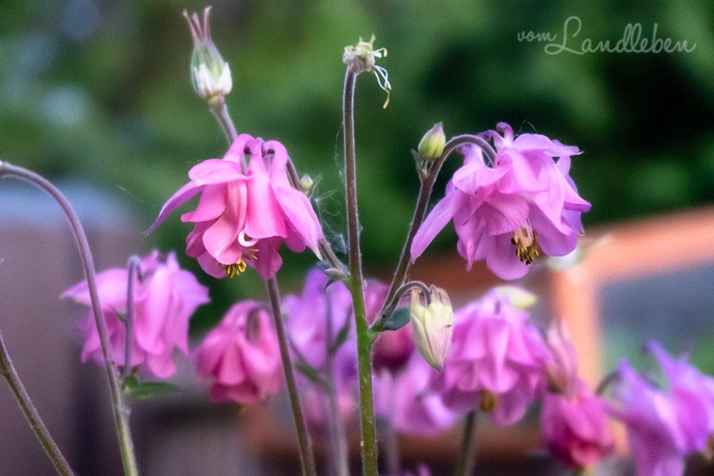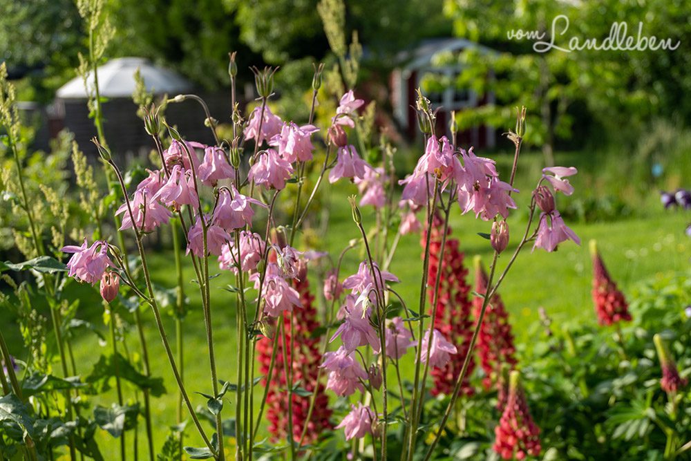 Akeleien und Lupinen haben sich in allen möglichen Farben wild ausgesät: