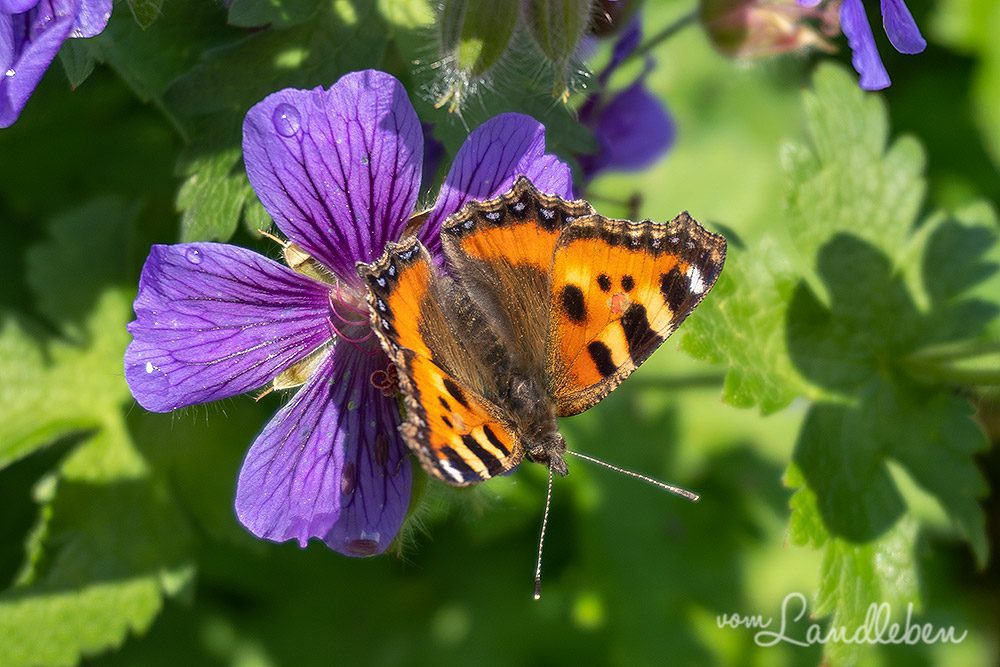 Auf dem Storchenschnabel, den du auf dem obigen Bild rechts siehst, hat es sich ein Kleiner Fuchs gemütlich gemacht: