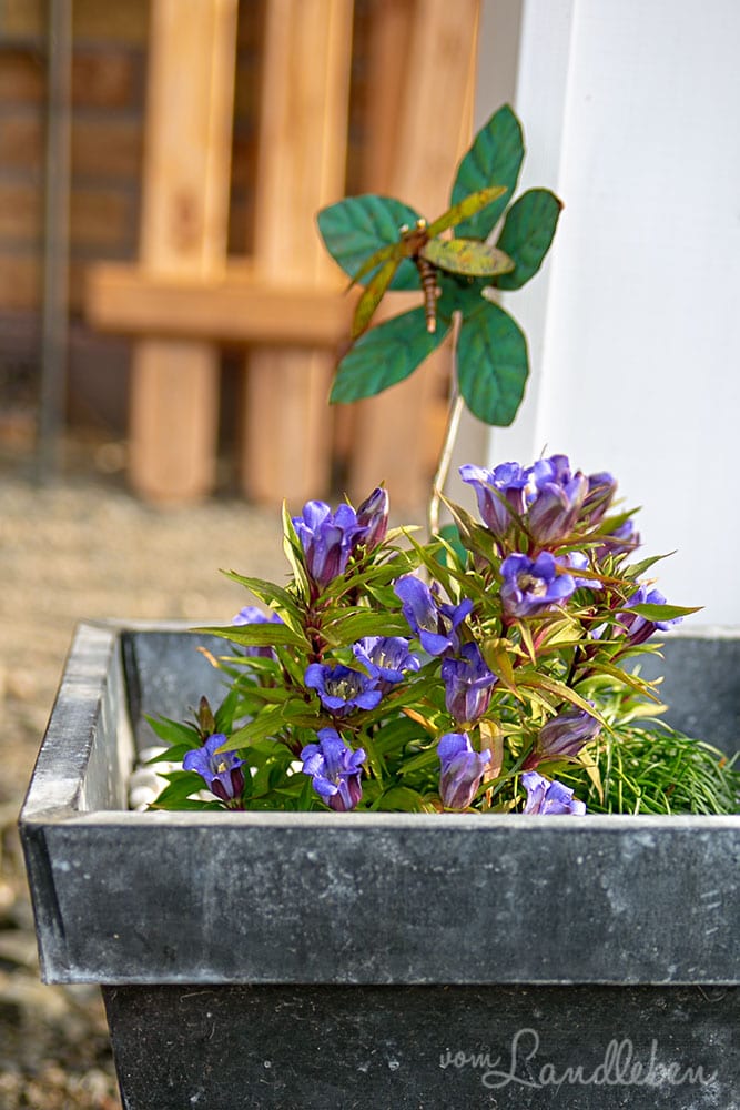 Besonders gefreut habe ich mich übrigens über die vielen Blüten an meinem Sorgenkind, dem Enzian. Den hatte ich vor zwei Jahren aus Mitleid gekauft, als er halb verkümmert auf dem berühmten Reduziert-Regal im Pflanzencenter stand. Zuerst hatte ich ihn an den Rand der Mulde gepflanzt, dort gefiel es ihm aber so überhaupt gar nicht.