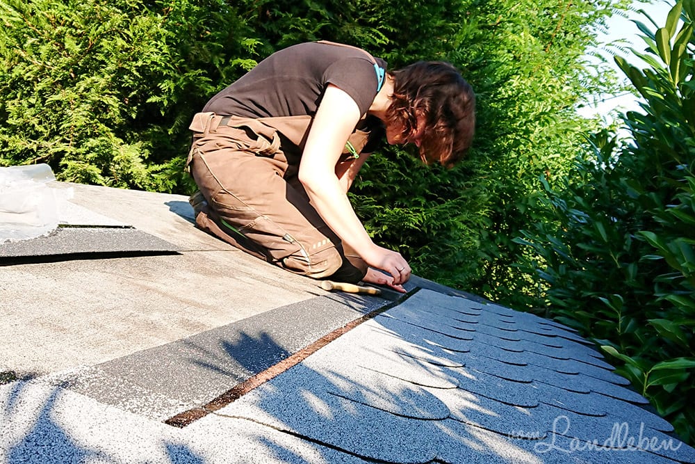 Den Anfang machte der Beste alleine, während ich arbeiten war, aber als Team funktionierte es später dann doch besser. Ich saß oben und kloppte die Nägel ein, der Beste reichte mir die entsprechend zugeschnittenen Schindeln an.