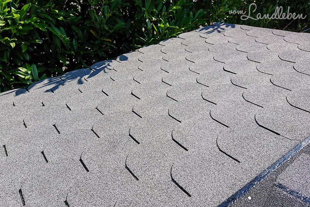 Im Baumarkt besorgten wir sogenannte Biberschindeln – das sind Bitumenstreifen, die auf der einen Seite so ähnlich gewellt sind wie die Dachschindeln auf Kinderzeichnungen. Oder eben wie Biberschwänze. Dazu kam eine Packung Rechteckschindeln, die wir später für den First brauchen würden.
