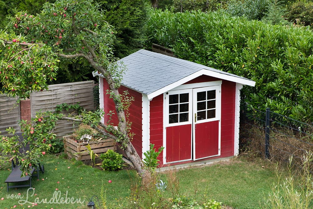 Also, ich hoffe, dass das jetzt so reicht. Beim Aufbau hatte ich die Kanten / aufeinander stoßenden Holzteile ja alle schon mit Bläuelsperre eingepinselt und das komplette Häuschen von außen mit Holzschutz. Den Schimmel drinnen habe ich im Winter direkt so gut es ging abgewaschen und mit diesem ekligen Chemiecocktail à la Anti-Schimmelspray eingesprüht, das wir noch von der maroden alten Wohnung hatten. Bislang ist es zumindest nicht mehr geworden…