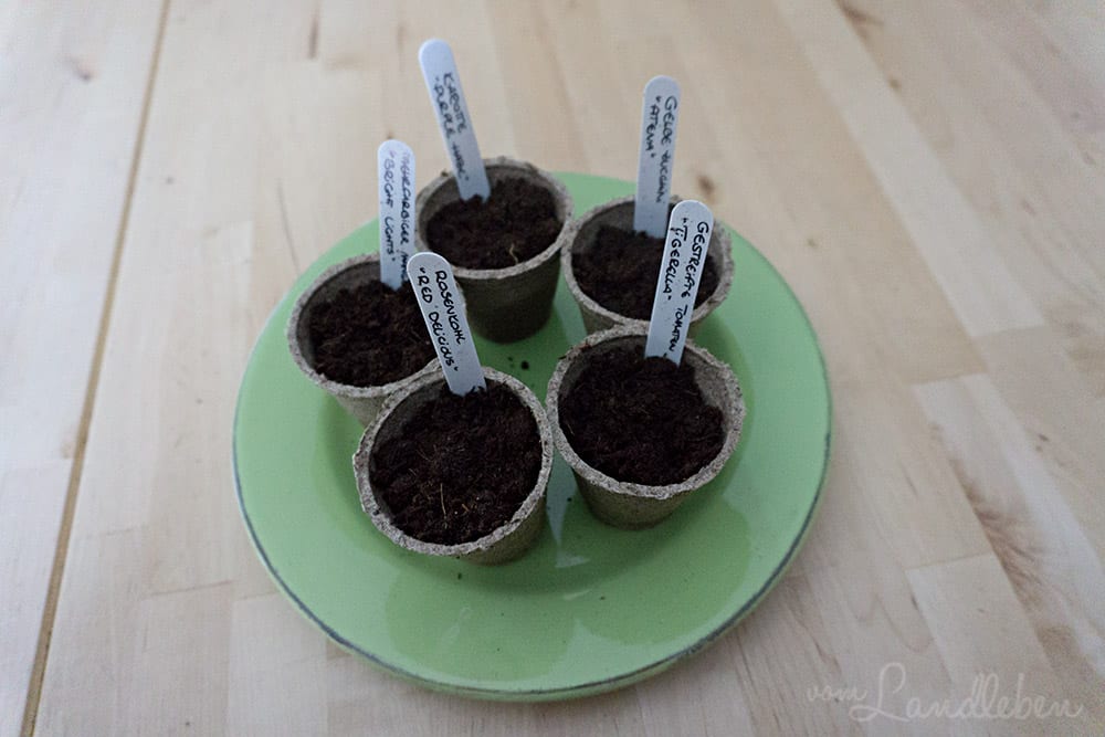 Pflanzenstecker verraten dir, in welchem Töpfchen du welche Sorte ausgesät hast. Es gibt sie in unterschiedlichen Varianten fertig zu kaufen, du kannst aber auch einfach einen Holzspatel beschriften oder du klebst etwas Masking Tape um einen Zahnstocher herum und bastelst dir damit eine Art Flagge.