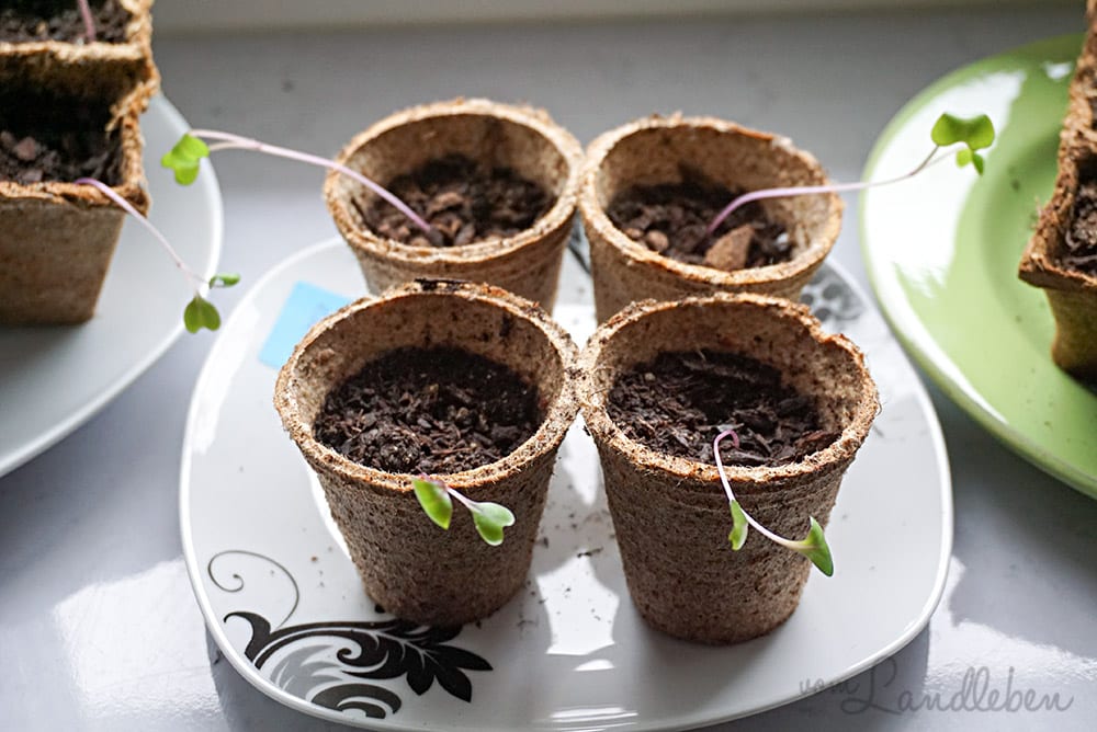 Das Praktische an Anzuchttöpfen aus Kokosfaser und Zellulose oder auch selbstgebastelten Varianten aus Zeitungspapier oder Eierkartons ist, dass sie komplett biologisch abbaubar sind. Du kannst die Pflänzchen später einfach mitsamt Topf ins Erdreich setzen und ersparst dir (und den Pflanzen) dadurch das Umpflanzen, was du etwa bei Joghurtbechern machen müsstest. Die Wände der Töpfchen lösen sich auf und können von den Wurzeln einfach durchdrungen werden.