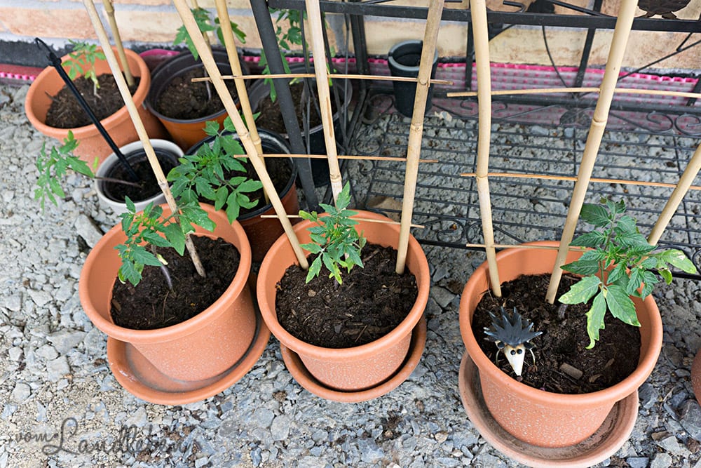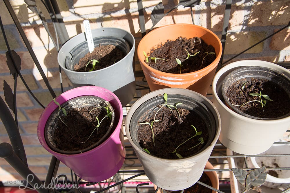 Mitte Mai habe ich die Pflänzchen in Töpfe umgesiedelt und nach draußen gestellt. Zu diesem Zeitpunkt sind die berüchtigten Eisheiligen vorbei, sprich, es wird aller Wahrscheinlichkeit nach keinen Kälteeinbruch mehr geben und du kannst deine Pflänzchen guten Gewissens auswildern. 😉